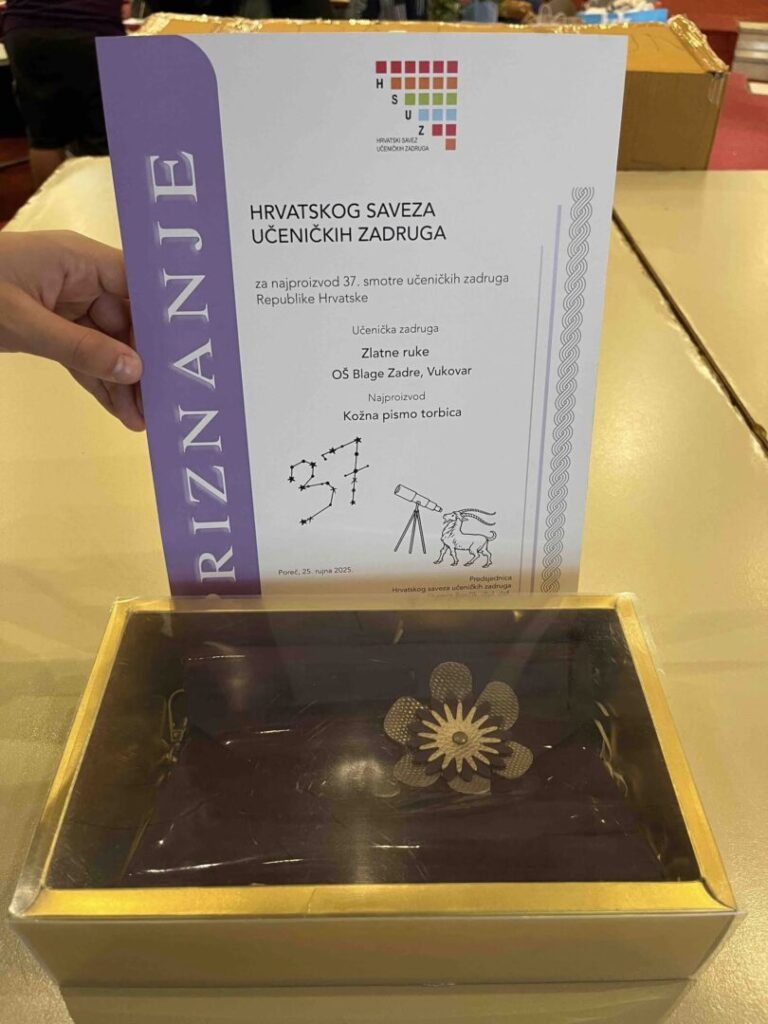 UZ Zlatne ruke osvojila je priznanje za najproizvod na 37. smotri učeničkih zadruga RH. “Kožna pismo torbica” dobila je brojne pohvale počevši od popunjavanja prijavnog obrasca, fotografija, ideje kao i sigurnosti naših zadrugarki u izradi torbice.