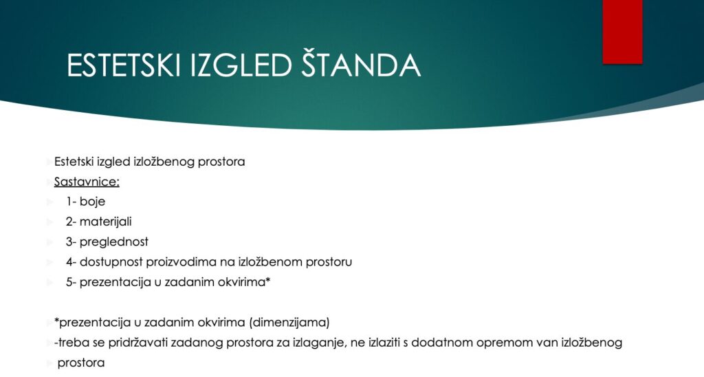 Na predavanju, pod nazivom „Estetski izgled štanda“, koje je održala učiteljica Patricija Burazin, sudionici su se upoznali sa sastavnicama dobrog izgleda izložbenog prostora, među kojima su boje, materijali, preglednost, dostupnost proizvoda te prezentacija unutar zadanih dimenzija izložbenog prostora. Posebna pažnja posvećena je tehničkim uvjetima izložbe i prostora koji također utječu na cjelokupan dojam štanda. Kroz niz praktičnih savjeta, istaknuto je kako samostojeće predmete treba rasporediti na horizontalne površine, slike izlagati po vertikalama te se pridržavati zadanih dimenzija bez korištenja dodatne opreme izvan dodijeljenog prostora. Predavanje je bilo interaktivno, jer su sudionici, uz brojne fotografije prikazane u prezentaciji, zajednički komentirali dobre i loše primjere postavljenih štandova.