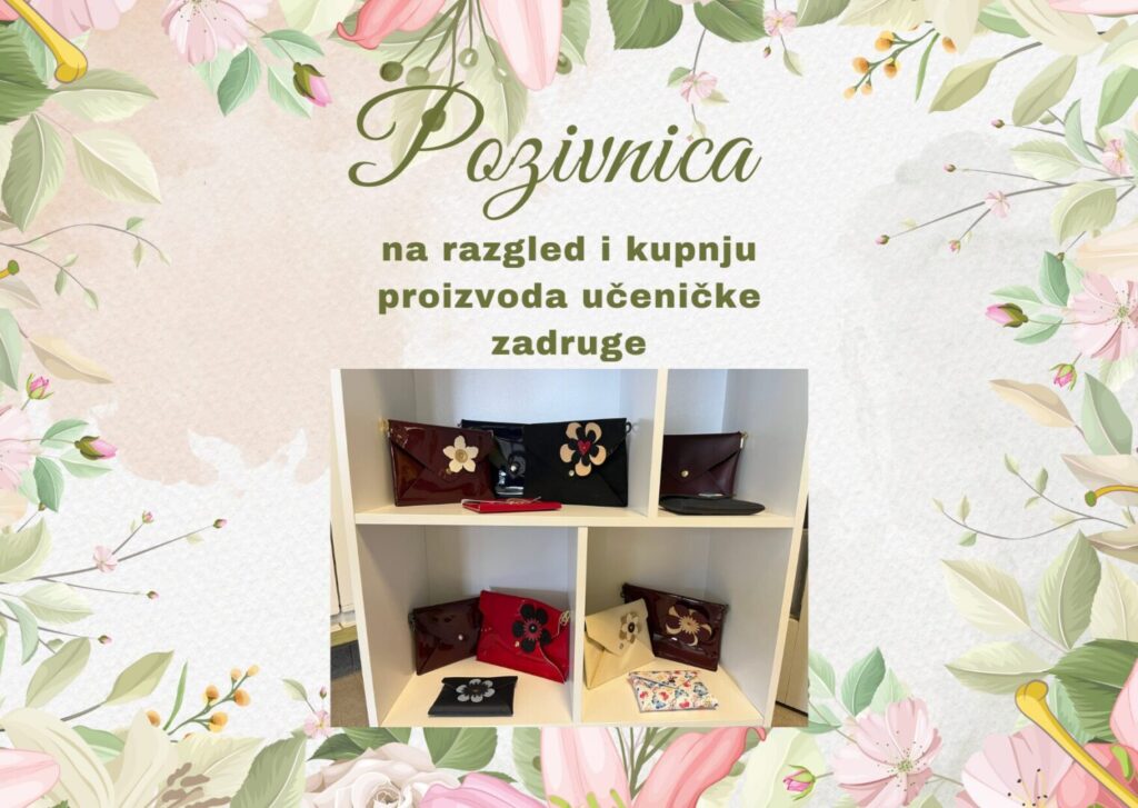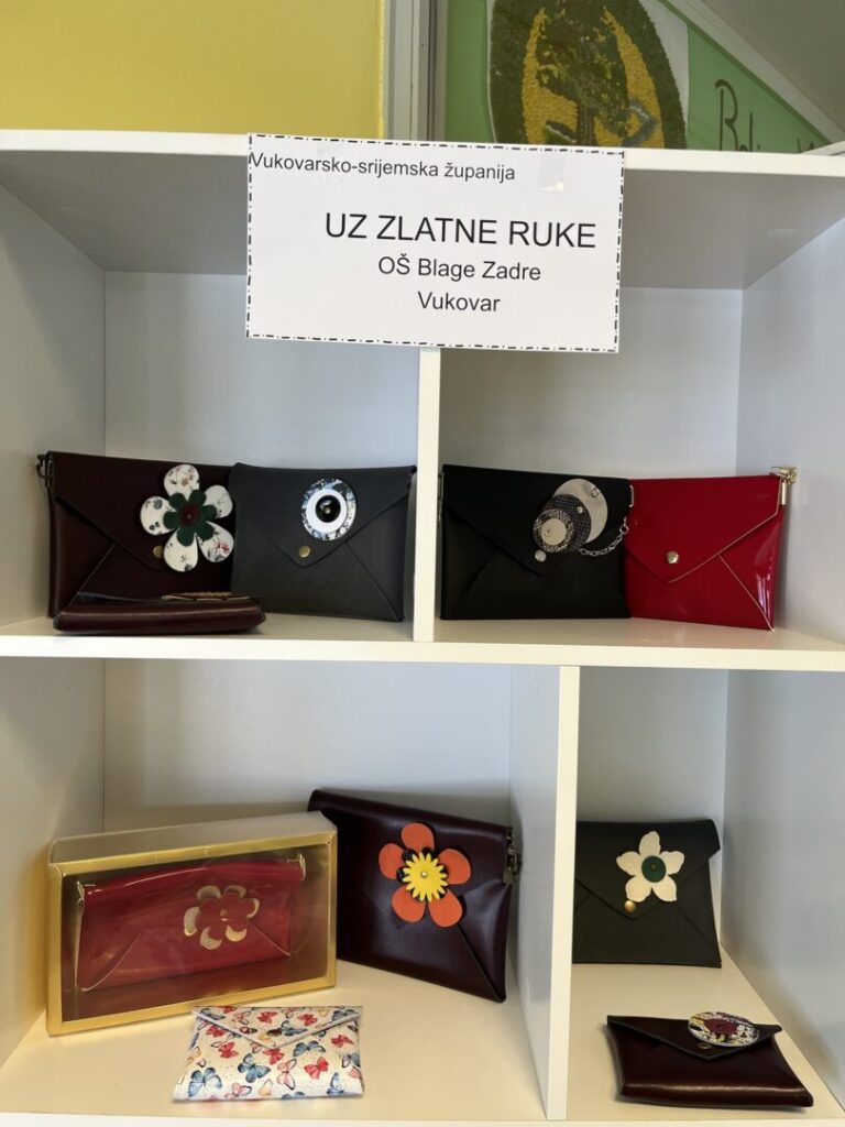 U predvorju škole postavljena je izložba školske zadruge na kojoj su predstavljene kožne pismo torbice, ručno izrađene s posebnom pažnjom i kreativnošću.