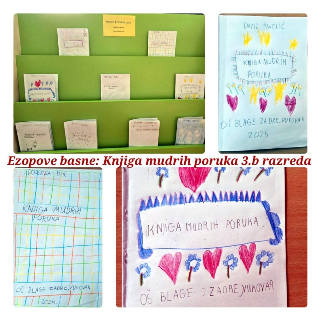 Izrađene knjige mudrih poruka učenika 3. b razreda izložene su u školskoj knjižnici. Aktivnošću je uspješno ostvarien cilj – učenici su potaknuti na čitanje, kreativno izražavanje i istraživanje svijeta knjige.